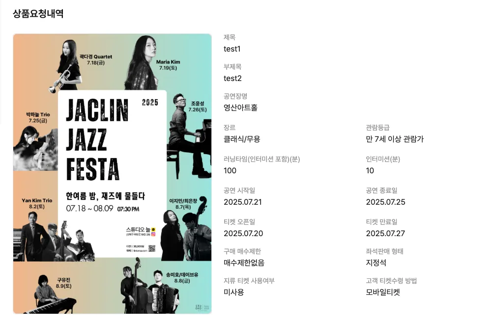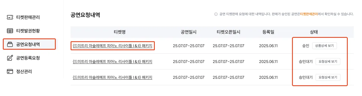 공연요청내역입니다. 공연이 등록되면 상태가 “승인”으로 변경되고 “상품상세 보기”를 클릭하면 상품상세 화면을 볼 수 있습니다.