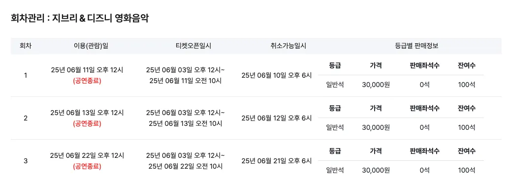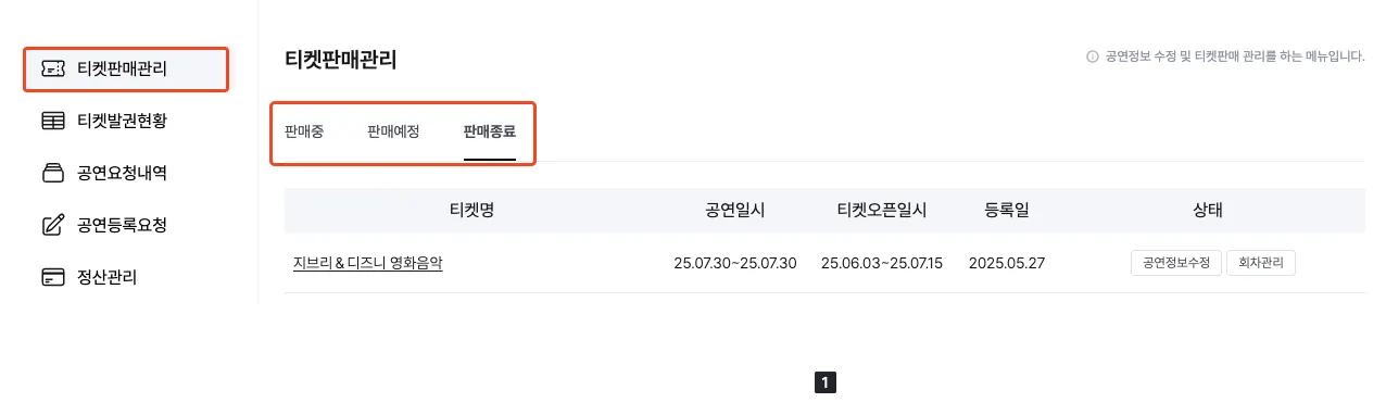 티켓판매관리에서 판매상태별로 공연리스트를 확인할 수 있습니다.