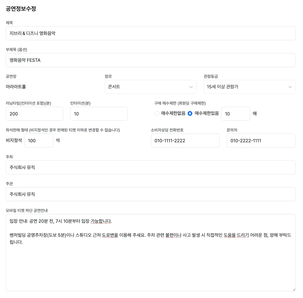 “공연정보수정” 버튼을 통해 공연정보를 수정할 수 있습니다. 비지정석인 경우 판매 좌석수 변경도 가능합니다.