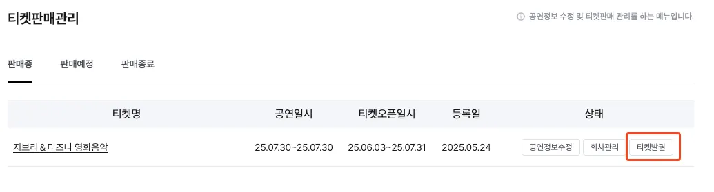 판매중인 공연은 “티켓발권” 기능을 통해 파트너 발권(초대권, 현장수령용 교환권 등)이 가능합니다.