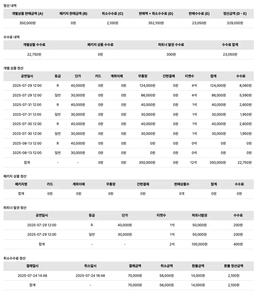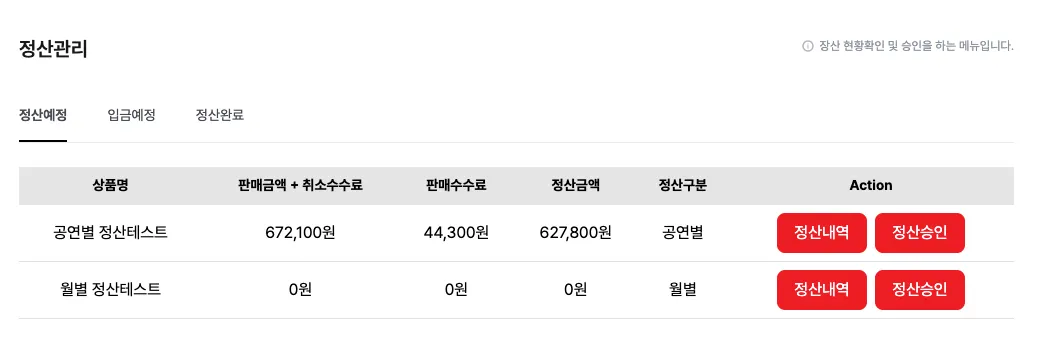 관리자가 정산 승인요청을 하면 공연별 정산현황을 확인 가능힙니다. ”정산내역 승인” 버튼을 클릭하면 입금예정 상태로 변경되며 승인 후 10 영업일 이내에 판매회원의 계좌로 정산금이 입금됩니다.
