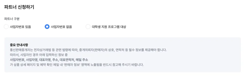 사업자번호가 없는 경우 아래 “사업자번호 없음”을 선택합니다.